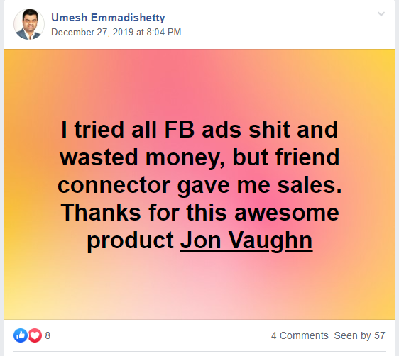 Love this! I was needing niche specific friends on my Facebook page and Friend Connector has allowed me to do that very easily! I am not techy and this was super simple to use.